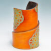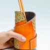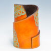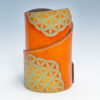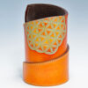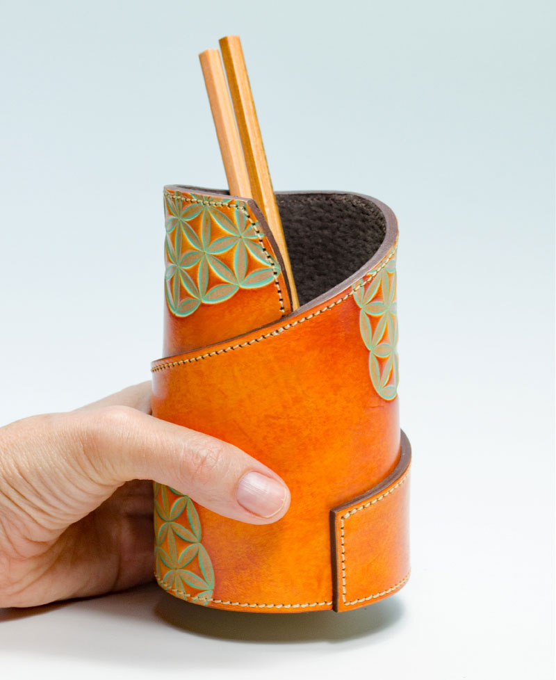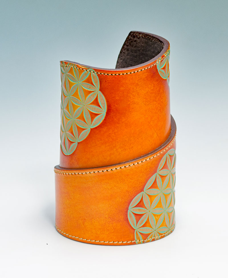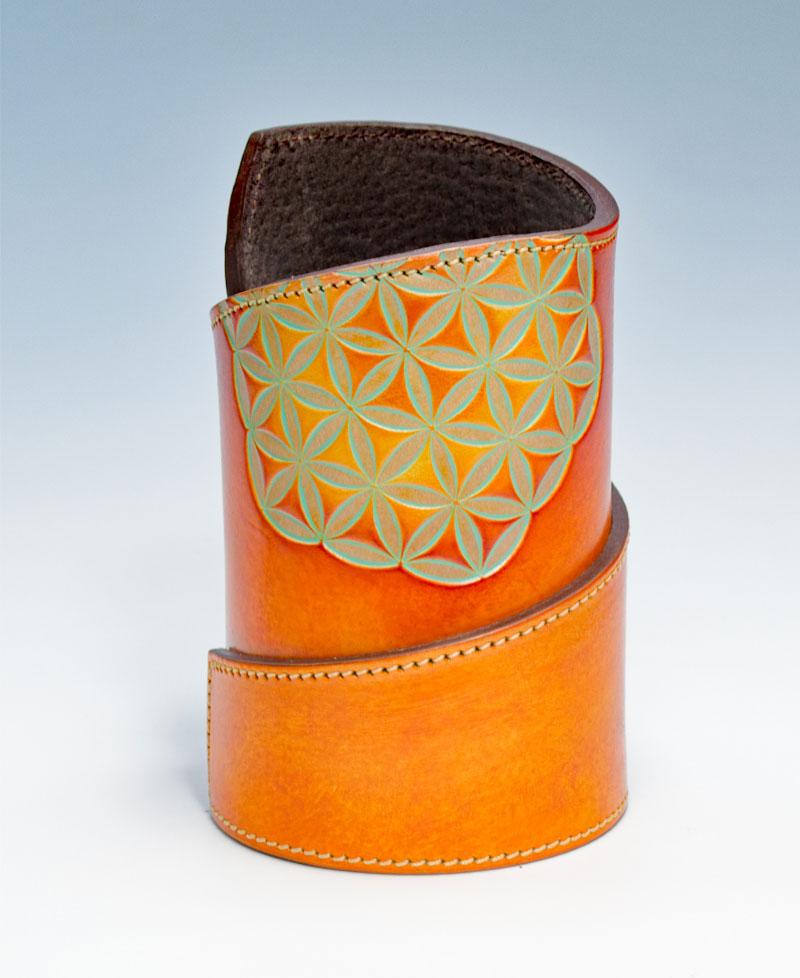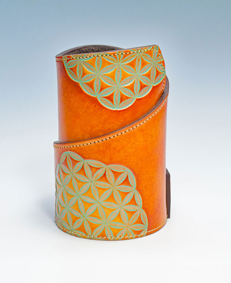 Elaborado en piel de vacuno con curtientes vegetales, grabada y policromada con tintes y pátinas que resaltan el elegante motivo decorativo que hace alusión a la Flor de la Vida. El interior está forrado con piel de pécari.